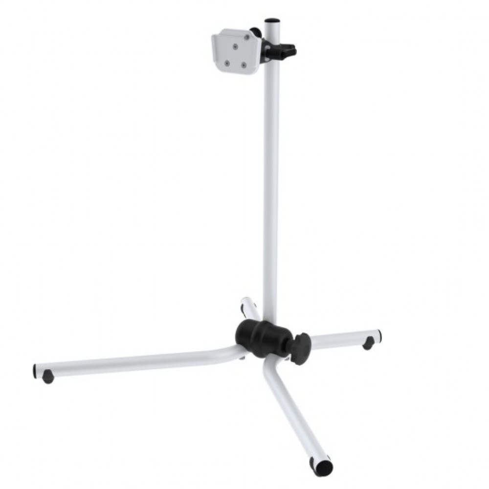 A table top mount suitbale for eye gaze systems. It has a solid X-formed adjustable frame with automatic surface leveling system