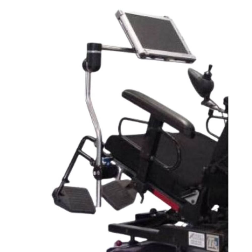 A folding eye gaze wheelchair mount compatible with a Permobil power wheelcahir and Vesa mounting plate. The Daessy folding mount uses a 2 step process to fold down and bring the tubes parallel to the user to assist with eye gaze callibration.