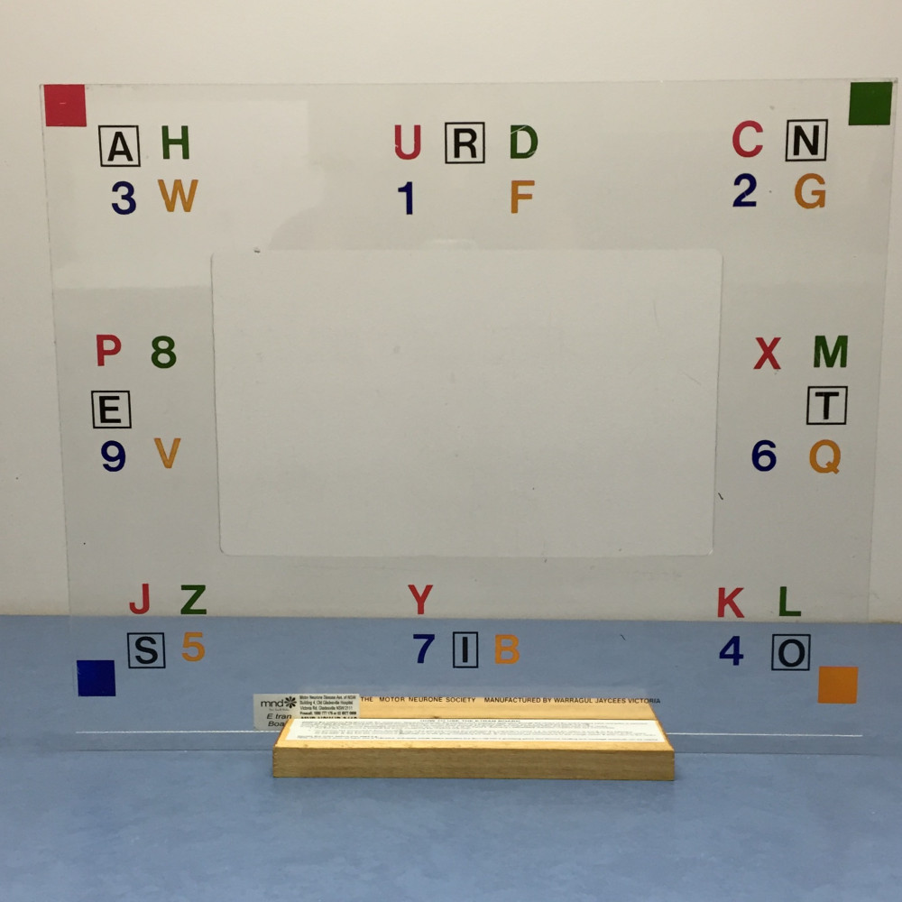 • A non-electronic communication board made from clear Perspex for face-to-face communication. It can be used by a person who has limited speech and motor control. It allows a person to spell out words using eye movement to communicate their wishes with their communication partner. It is a great low tech option to have as a back up when electronic communication devices stop working.